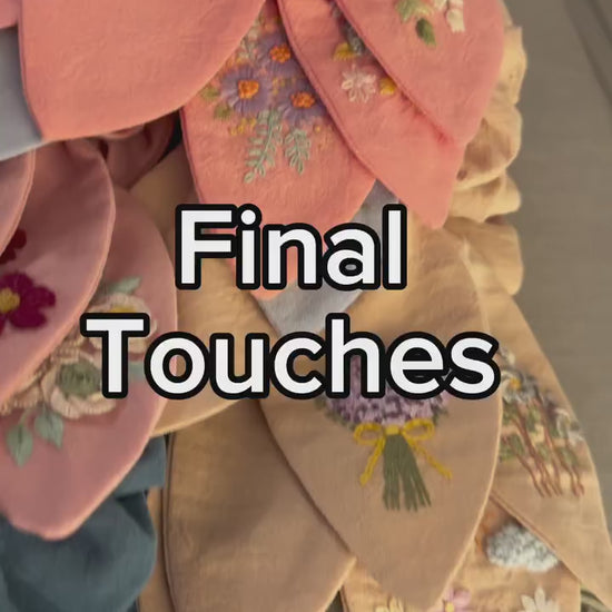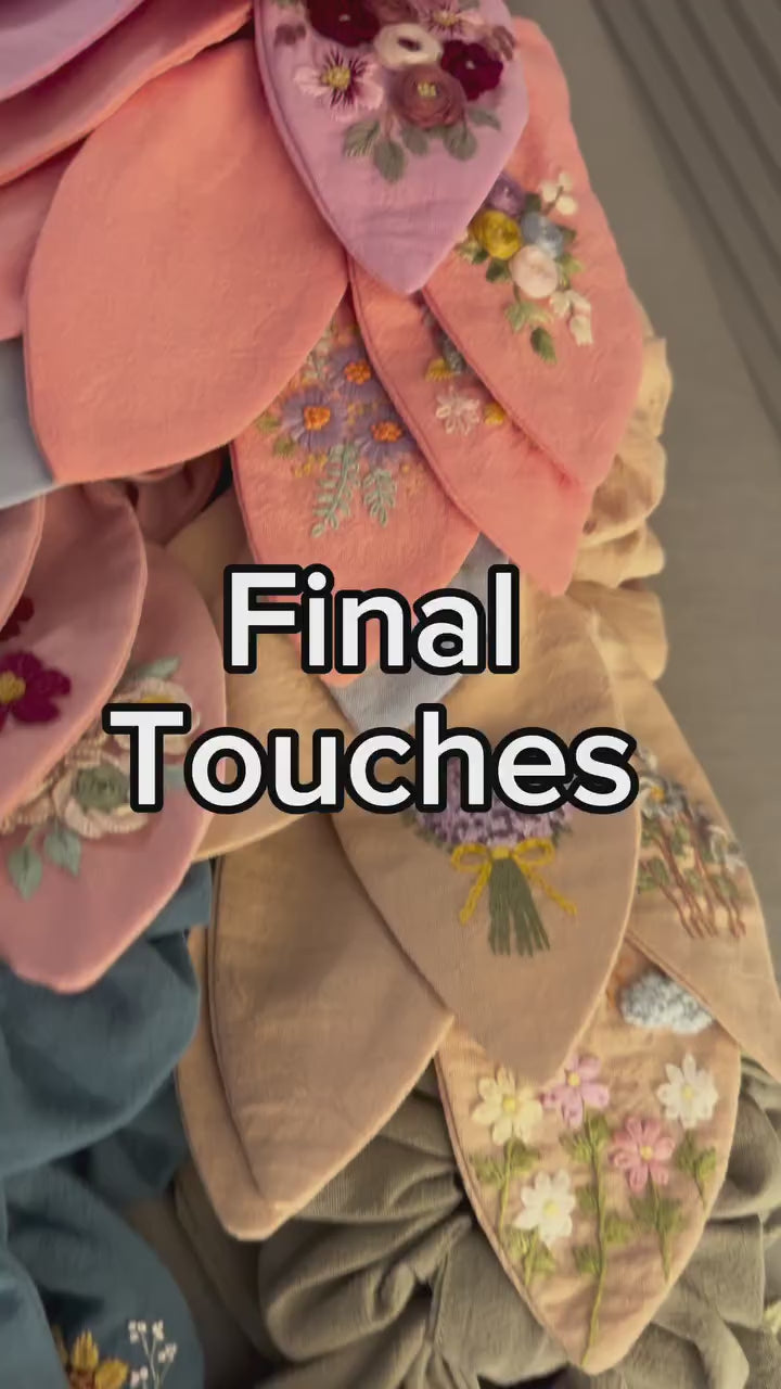 Each scrunchie is a one-of-a-kind, authentic creation, lovingly hand-embroidered and designed to surprise and delight.